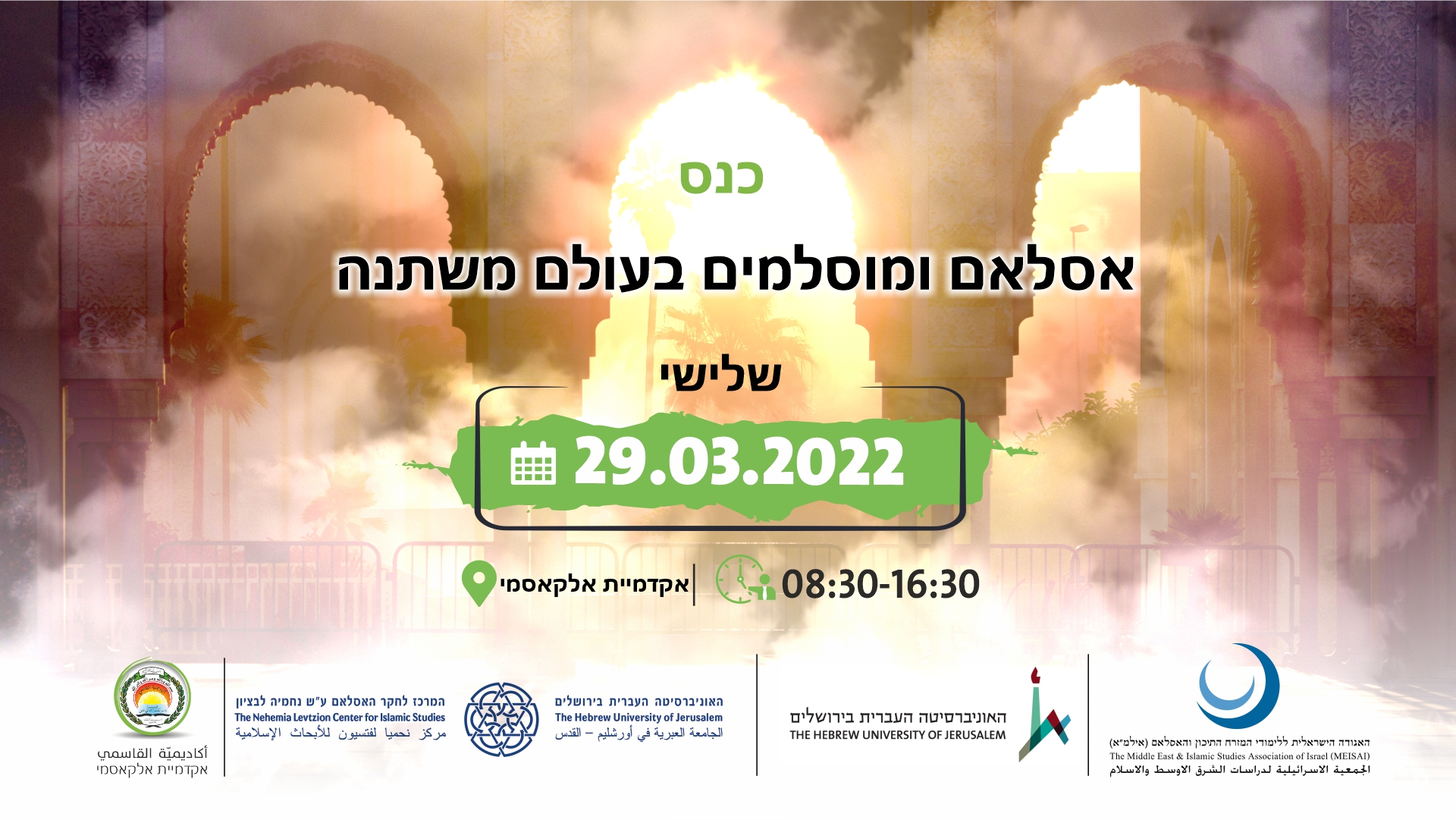אקדמיית אל-קאסמי שמחה לארח כנס משותף עם החוג ללימודי האסלאם והמזה”ת (האוניברסיטה העברית), בחסות אילמ”א. הכנס יוקדש לדרכים שבהן דת האסלאם, המשפט המוסלמי והחברות המוסלמיות מתמודדים עם אתגרי הזמן והשינויים החברתיים, הכלכליים והפוליטיים לאורך תקופות היסטוריות שונות עד ימינו.